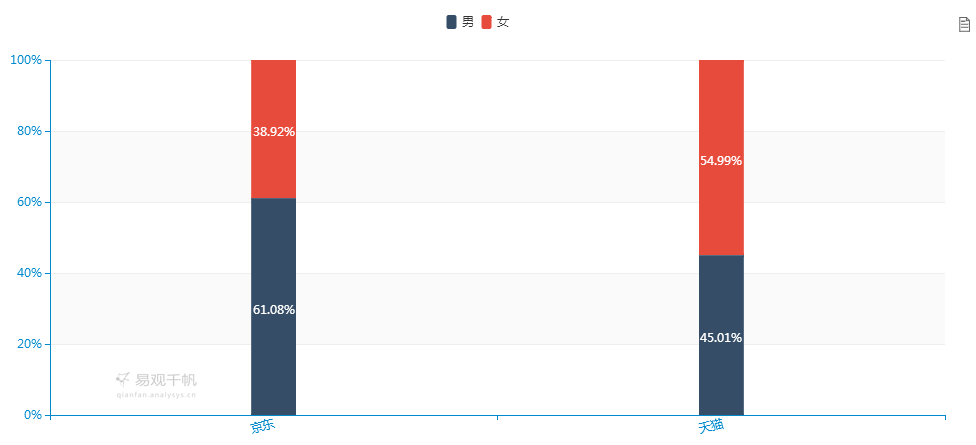 2017年3月份,京东月活跃用户量为8137.07万,天猫为3559.22万京东在此项上优势明显;而在用户性别上,京东男性用户占有较大比例,为61.08%,天猫则是女性用户在数量上占优,为54.99%;