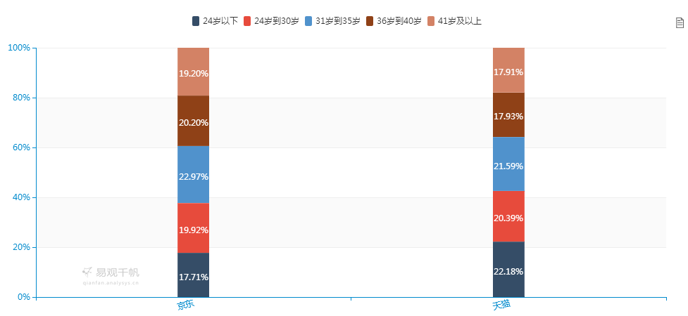 用户年龄分布上,京东与天猫整体都较为均匀,京东31-35岁的用户稍多,占22.97%,天猫则是24岁以下的用户稍多,占22.18%,而根据“全国网络零售发展指数”显示,从消费者网络零售参与度来看,80、90后等互联网“原住民”逐渐成为消费的主力人群,在网购用户中占比超过65%,消费结构从生活保障型消费向享受型、品质型消费升级。