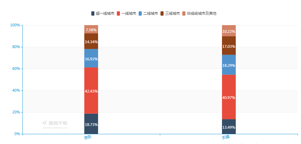 在用户地域分布上,京东和天猫皆是一线城市用户数量占多,京东为42.43%,天猫40.97%,但在超一线城市的用户数量比例上京东高于天猫,而天猫则在二线城市、三线城市、非线级城市及其他区域的用户比例上高于京东。