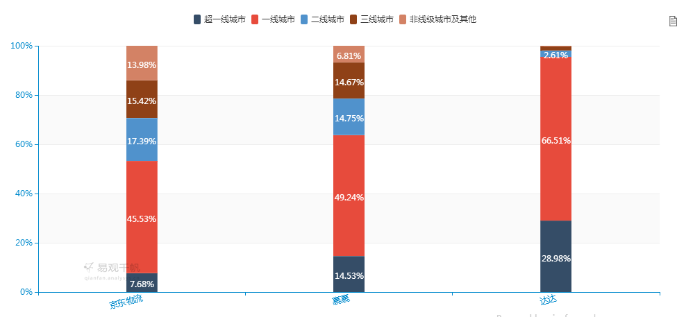 而在用户城市分布上,三者皆以一线城市用户为主,京东物流、裹裹、达达在一线城市用户比例上分别为45.53%、49.24%、66.51%,在超一线城市用户比例分布上,达达比例最高,其次是裹裹,最后是京东物流,而在二线城市、三线城市、非线级城市及其他区域用户分布比例上,则是京东物流比例最高,其次是裹裹,最后是达达。