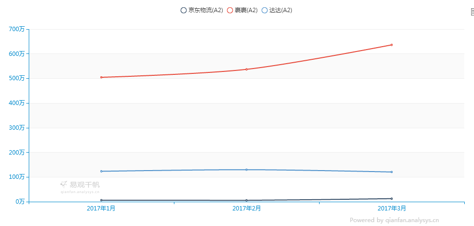 根据千帆数据显示,2017年1月到3月,京东、京东金融、京东物流这3个APP在活跃用户量上整体都有了一定增长,而京东到家的APP活跃用户量则有所下跌。其中,京东1月份活跃用户量为6807.65万,3月份为8137.07万;京东金融1月份活跃用户量为461.75万,3月份为681.03万;京东物流1月份活跃用户量为6.16万,3月份为12.33万。而活跃用户量下跌的京东到家1月份是180.2万,3月份则是139.57万。