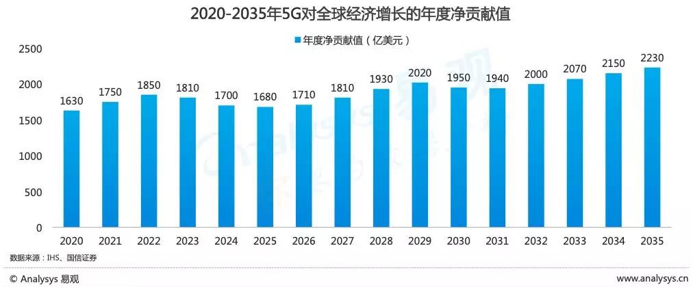 2019-2020年是5G商用元年。到2035年,预计对全球经济增长的年度净贡献值达到2230亿美元。