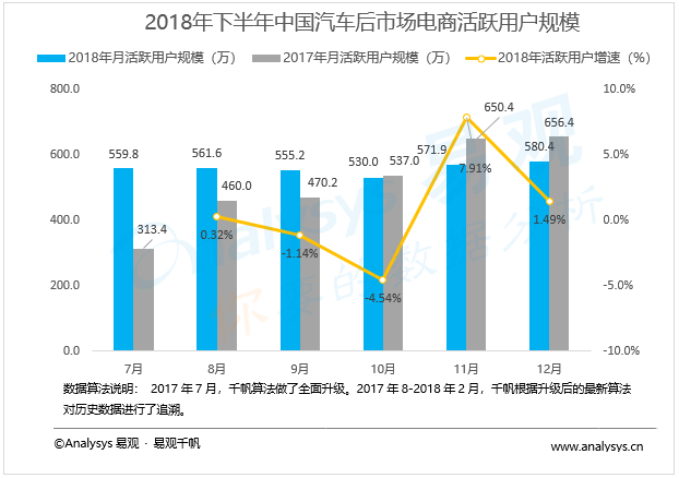 2018年下半年,中国汽车后市场电商领域活跃用户规模增速放缓,下半年复合增长率为0.6%。截至2018年12月,汽车后市场电商活跃用户规模为580.4万,受到汽车保有量增长缓慢、共享出行及车队服务快速发展等因素影响,汽车后市场电商活跃用户规模环比下降 11.2%。由于双十一各平台的折扣促销活动,及冬日车主发动机、燃油箱等维修保养需求、轮胎更换需求的增高,2018年11月至12月,车后服务领域活跃用户数量小幅攀升。