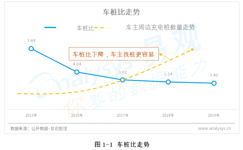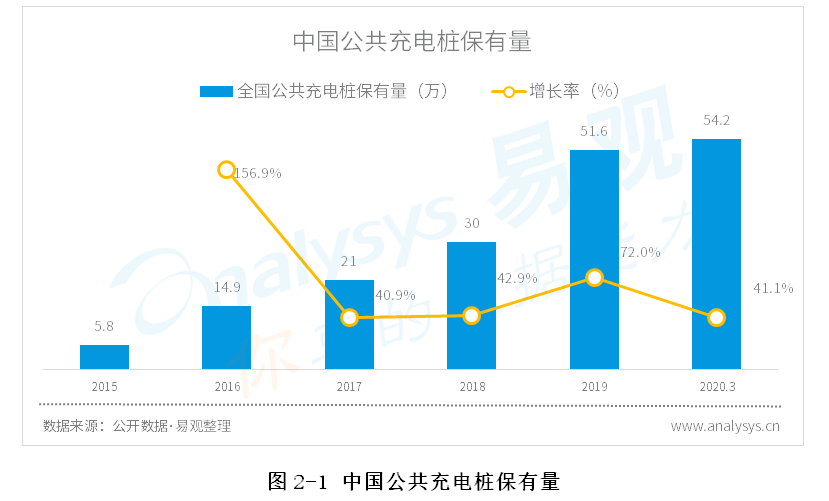 截至2020年3月,全国充电基础设施累计数量为126.7万台,同比增加37.6%。其中,公共类充电桩54.2万台。受疫情影响,对比2019年底只增加了5%,但受益于去年下半年的高速增长,同比依然增加41%。新基建概念拉动大量资金涌入,随着复工复产的全面展开,充电桩建设在下半年建设必然提速。预计2020年、2021年公共充电桩保有量分别达到93.9、164.3万,增幅为82%、75%。但Analysys易观认为随着新能源汽车续航里程提升、快充技术发展,以及大数据匹配技术的进步,Analysys易观认为未来并非需要实现“一车一桩”,车桩比突破2:1之后便可实现较好的用车体验。