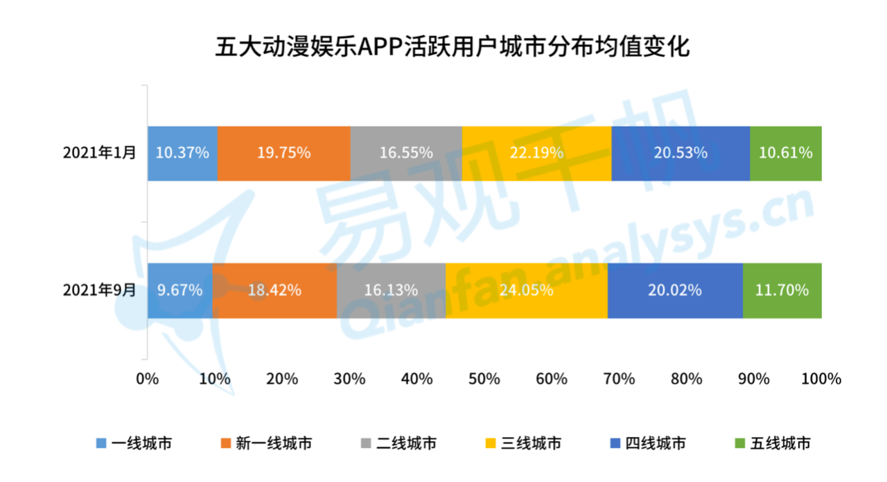 在城市分布上,对比五大动漫娱乐APP的9月和1月占比均值可以发现,活跃用户从一二线城市在往三线及五线城市渗透,三线和五线用户平均占比小幅上升。