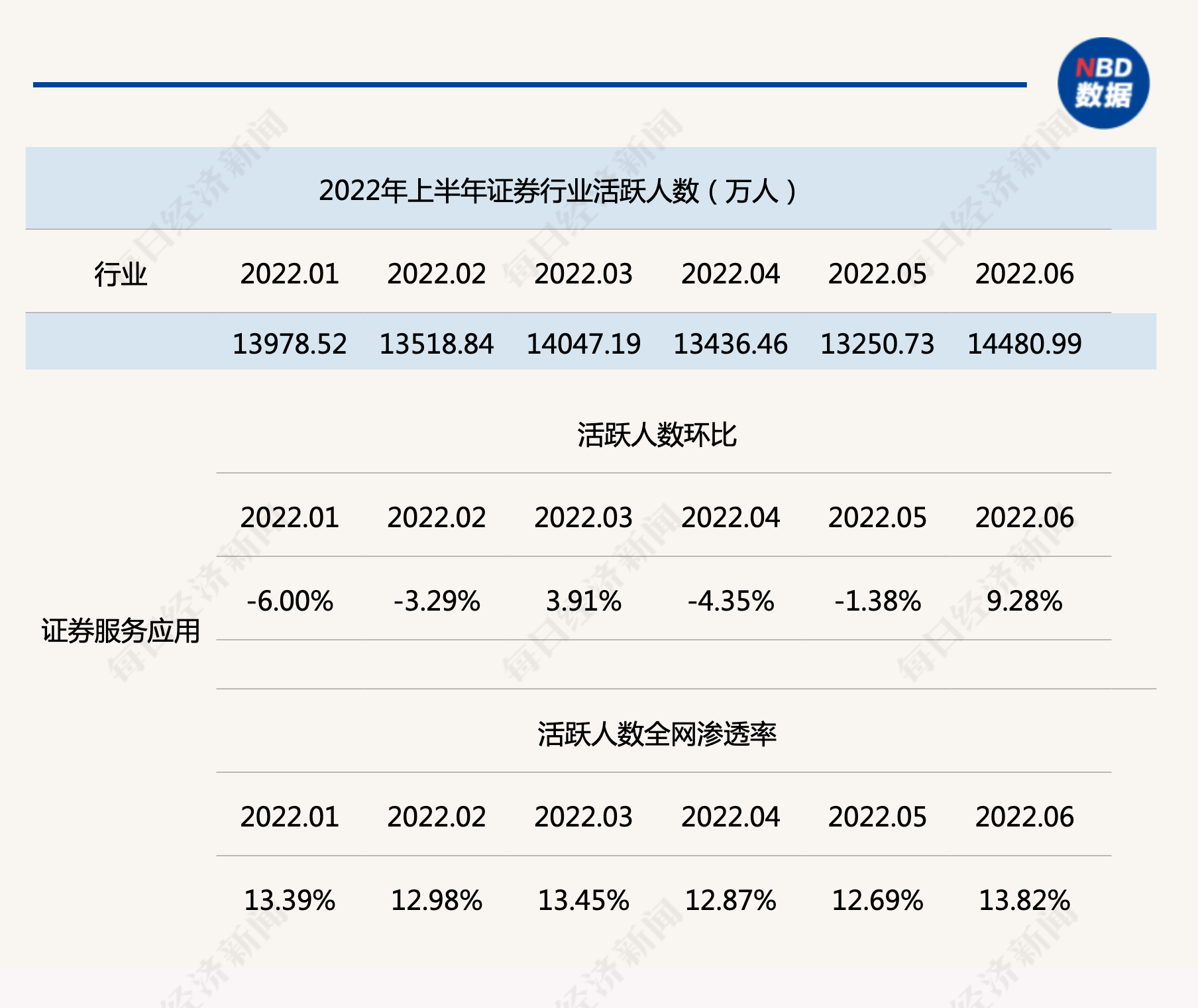 2022年以来,A股市场波动明显,不少投资者账户进入浮亏状态,券业App月活也在不断走低。而2022上半年的最低点出现在5月,当月券业APP月活人数只有1.33亿人左右,环比下降1.38%。此外,数据进一步显示,6月证券行业活跃人数全网渗透率则是达到了2022年以来的新高,增长至13.82%。
