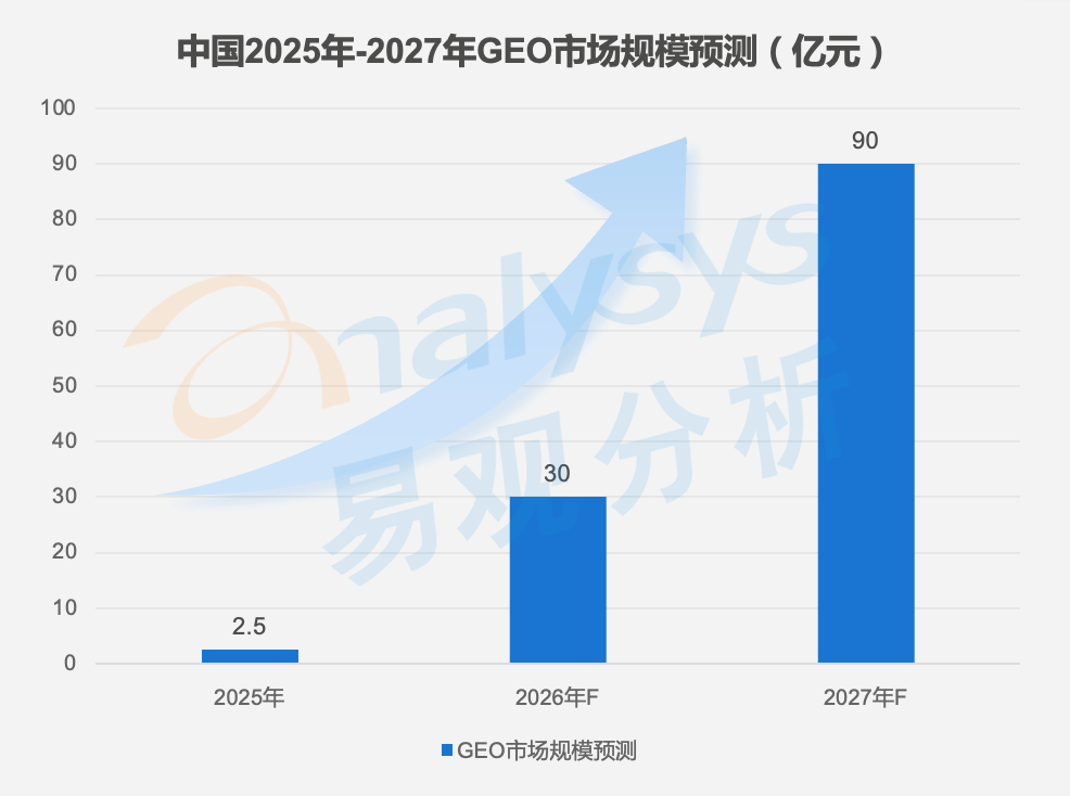 2025年GEO市场规模仅约2.5亿元——下半年市场刚被看见,预算多来自“剩余款”和试点小额预算。2026年GEO市场规模预计跃升至30亿元——从“试点”正式“立项”,从“边角料”转为“主预算池”,行业进入第一次规模化扩张。预计2027年市场规模达到90亿元。